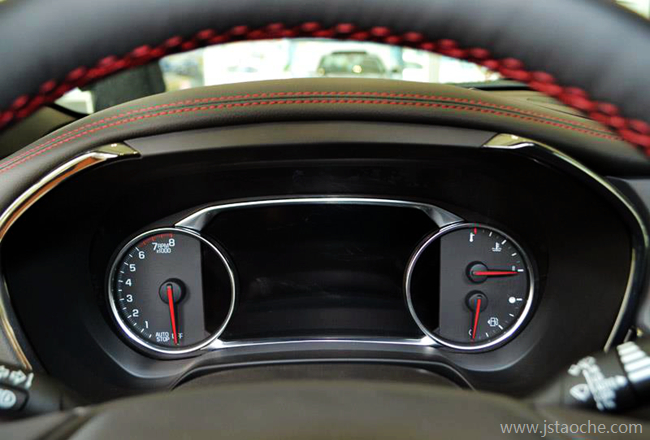 四幅式的方向盘带有红色缝线和银色装饰,看起来美国风格非常浓烈,更像是属于一辆皮卡或者是Muscle Car,粗犷之中带着几分运动,功能性也挺出色。开拓者的仪表应该称之为半液晶仪表,两侧依旧有着机械指针,而中间的彩色液晶屏有着很好的融入感,可以显示提供的各种行车信息也足够丰富。