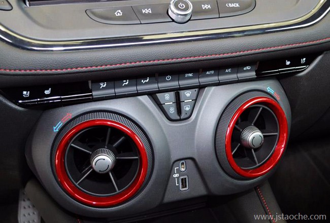 双区域自动空调控制区采用了实体按键的形式,很直观,圆形的空调出风口有着红色的包边,看起来战斗感十足,值得一提的是,空调温度调节并不是通过按键,而是要旋转出风口的外圈,别出心裁的设计。