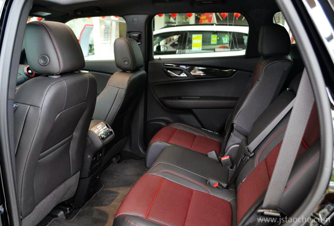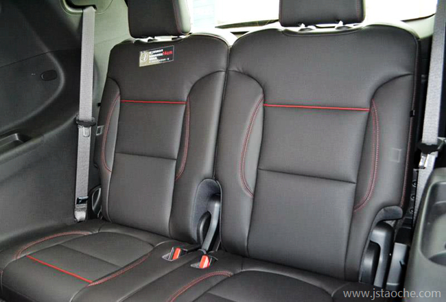 前排黑红撞色的打孔真皮座椅宽大而厚实,舒适性值得称道,正副驾驶席都是电动调节,主驾坐席还有电动腰靠调节和两组位置记忆功能。第二排空间足够宽敞,在座椅位置调节到最靠后的情况下,头部和腿部都有着很充裕的余量,脚下也没有明显隆起的地台。在第二排座椅调到最靠前位置的情况下,第三排空间还是可以乘坐成年人的,肯定谈不上有多舒服,但临时应急使用不成问题,同时还提供了空调出风口和杯架。