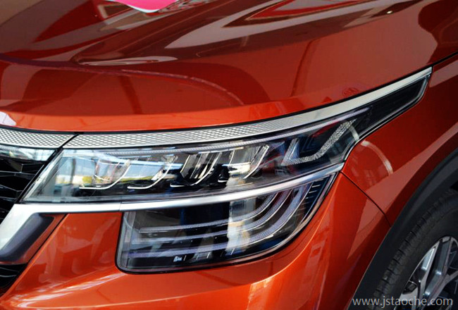 车头是起亚经典的虎啸式进气格栅,进气格栅周围的镀铬饰条向上的那一面还有一些棱形突起的设计,在不同方向光线照射下有不同的光影效果。 前大灯采用了一个异形的设计,由中网镀铬饰条分成两部分,大灯造型还是很别致的。