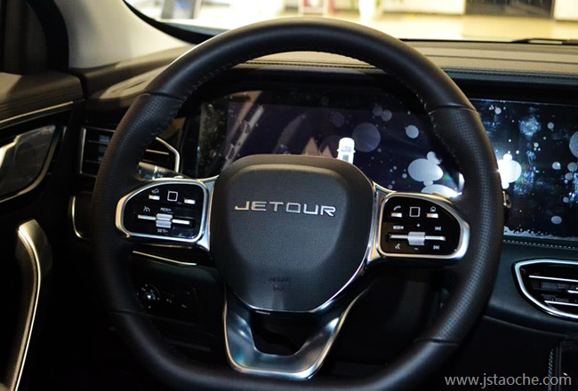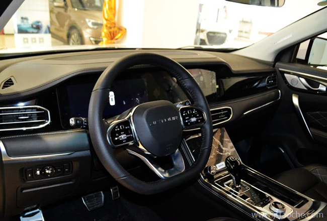 捷途X95内饰让人眼前一亮,档次感与科技感的营造十分到位。中控台设有3块屏幕,分别是12.3英寸全液晶仪表盘、12.3英寸中控屏幕和触摸式9.7英寸空调大屏。传统的机械按键基本被这三块屏幕取代,布局上规整有序,大面积的钢琴黑色中控面板与座椅、门板上的菱形纹路让视觉显得优雅、精致。
