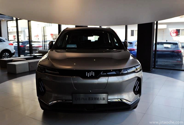威马EX6Plus前脸部分整体轮廓与EX5类似,封闭式前格栅造型配合承托式前车标饰板,大灯部分进行重新调整,前脸的造型简洁又很有时尚感。