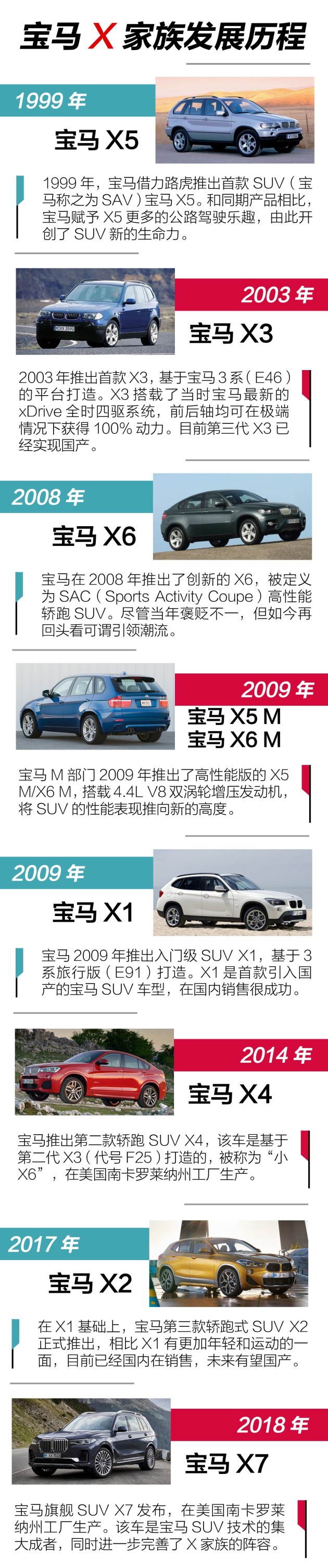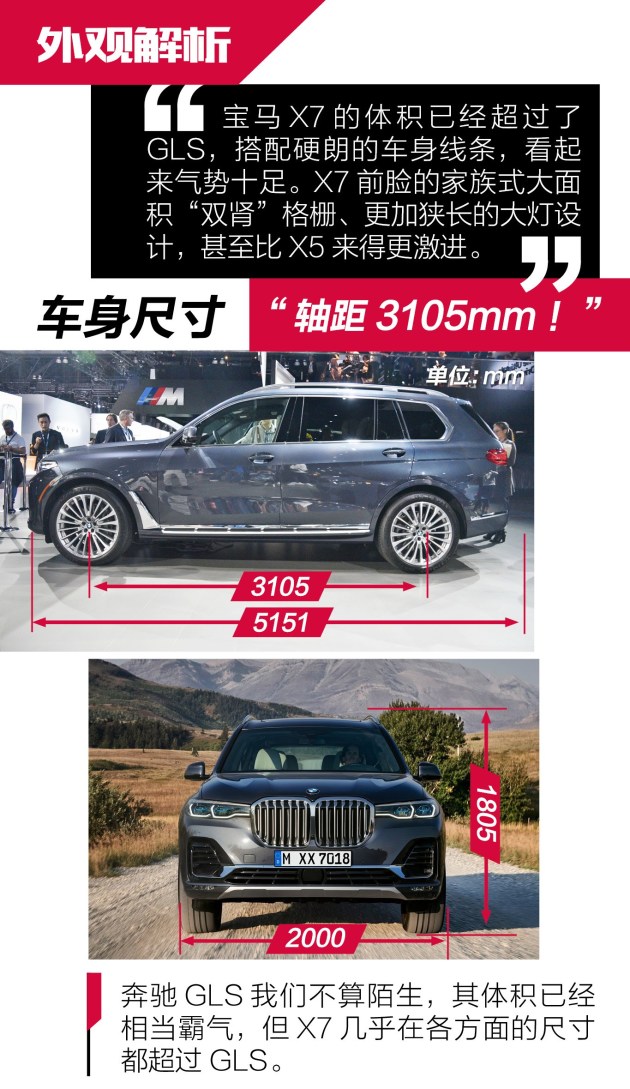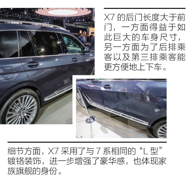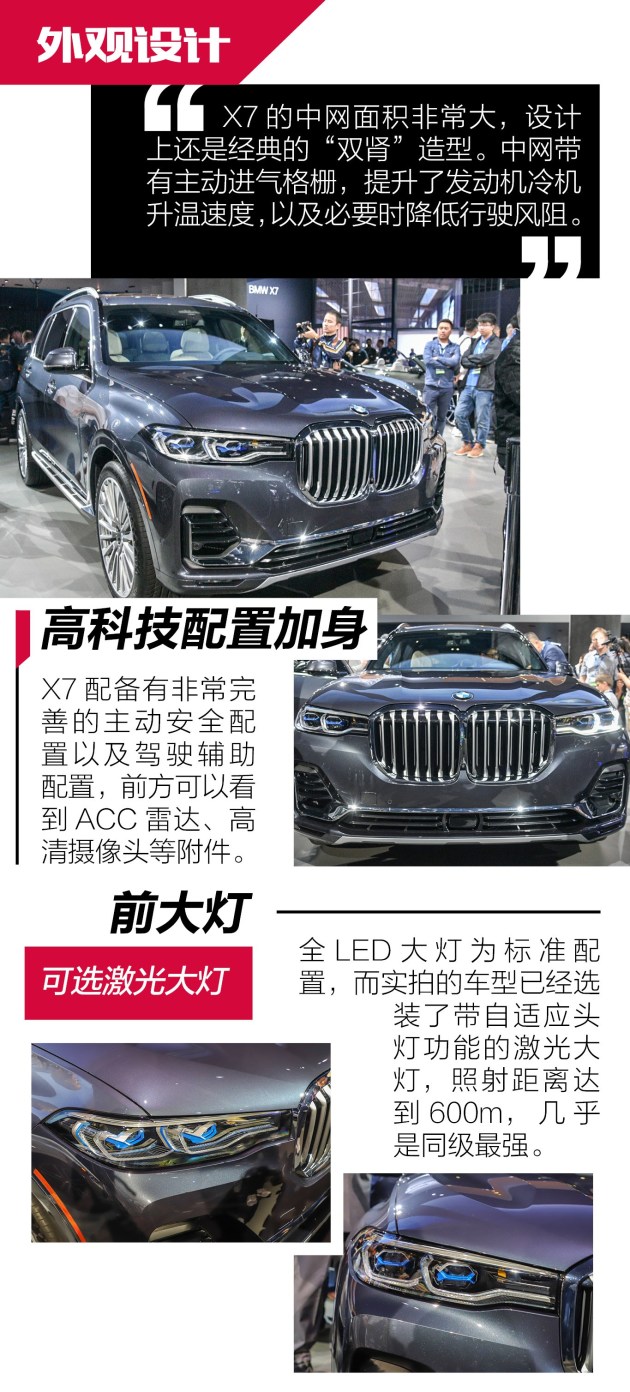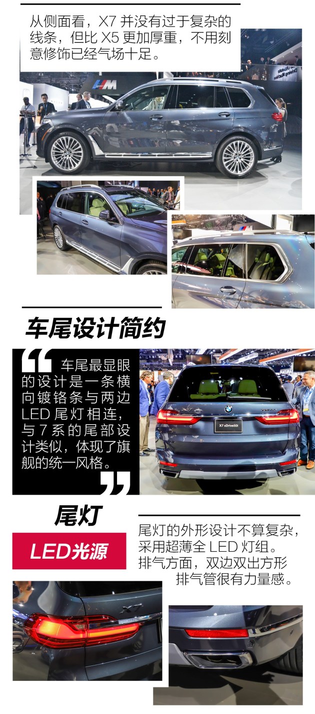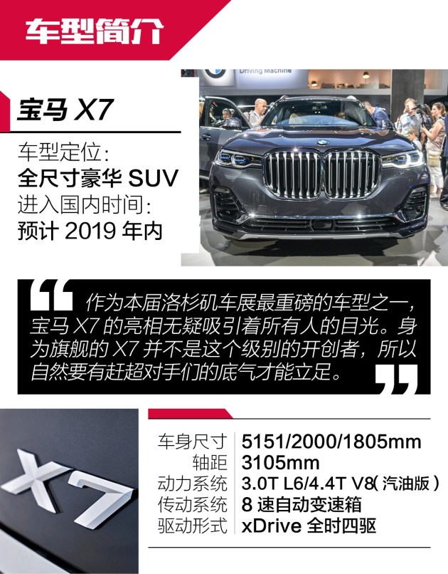 洛杉矶车展抢先体验宝马X7 全尺寸豪华SUV新境界 抢先体验 宝马汽车成立自1916年,但一直到1999年才推出首款SUV车型。不过宝马X家族自推出就一直很受欢迎,目前已经推出了从X1到X6全系列车型,销量也占到了总销量的1/3,可以说非常成功。而本次洛杉矶车展发布的旗舰SUV X7,则让宝马的SUV阵列更加完整,也展示了宝马在SUV领域的最高造诣。宝马X7外观:尺寸巨大 气势如虹