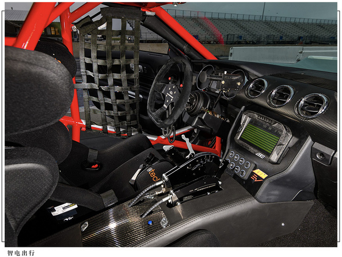 从外媒此前发布的福特Mustang Cobra Jet 1400车型图片看,新车外观造型普通版基本一致,配备多边形黑色进气格栅,由于采用了电动系统,格栅中间的LOGO边缘采用蓝色装饰。车内配备赛车防滚架,同时多处区域采用碳纤维饰板,或为减轻车身重量从而获得更好的加速成绩。