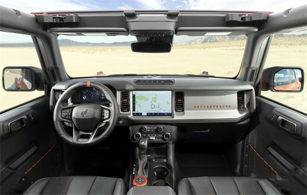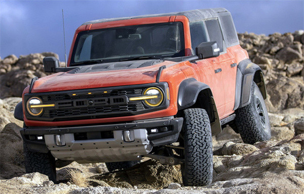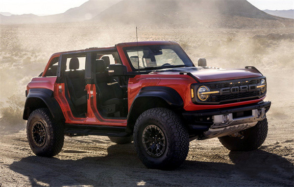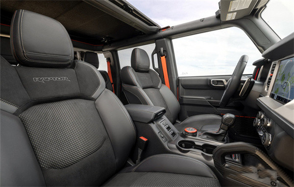 同时,福特Bronco Raptor车型还可实现四门以及顶棚快速拆卸,并提供了加固结构车身、更坚固的车轴以及升级的分动箱和全面修改的悬架系统。同时,新车还将提供37寸BFGoodrich KO2 全地形轮胎,离地间隙为333mm,相比Jeep牧马人车型更具硬派气息。