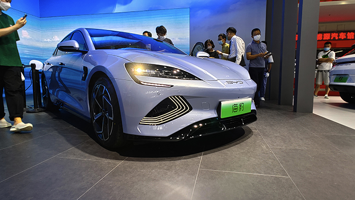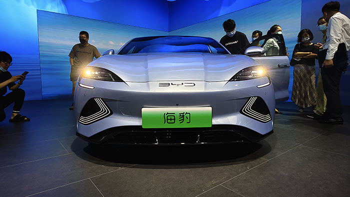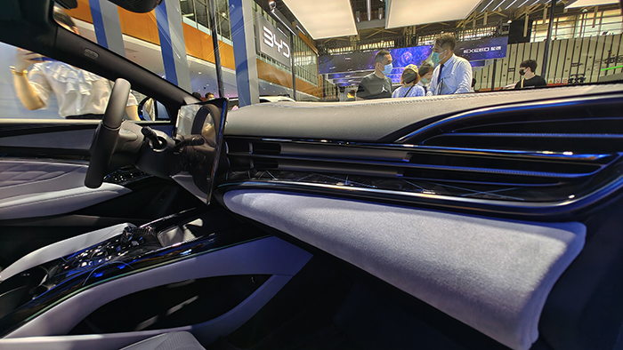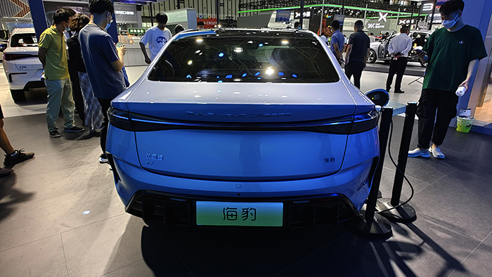 比亚迪海洋网新车海豹亮相车展现场,可以说是本次车展热度最高的车型,没有之一。据悉,海豹将推出4款车型,最高续航达到700km(CLTC),搭载基于e平台3.0打造的CTB电池车身一体化技术。