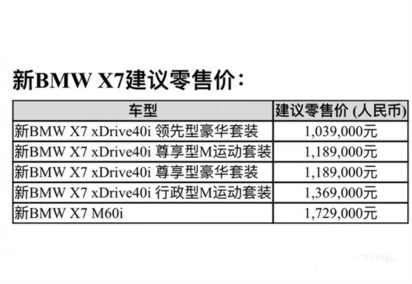 目前宝马新款X7车型已在国内市场正式开售,新车共计推出了5款车型,国内市场起售价为103.90万元,相比老款车型起售价上涨了3.9万元,并同步推出了M60i车型取代老款车型中的M50i车型。同时,新车也将同级主要竞争对手指向了奔驰GLS、凯迪拉克凯雷德、雷克萨斯LX等车型。
