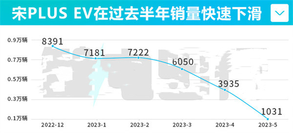 搜狐网公布的汽车零售数据显示,比亚迪宋PLUS EV自2022年12月销量达到阶段峰值后,今年以来持续下跌,5月仅卖出1,031台,较2022年12月暴跌87.7%。为提振销量,比亚迪于6月19日推出了宋PLUS EV冠军版,起售价较2021款入门版车型降幅高达3.4万元,“价格战”愈演愈烈。