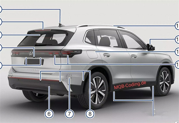从发布的新车图片中可以看出,大众新款Tiguan车型头部装配了多横幅造型进气格栅,上方LED日间行车灯带贯穿至两侧头灯组。车尾部分选用了隐藏式排气布局,尾门上方还首次装配了贯穿式LED尾灯组。