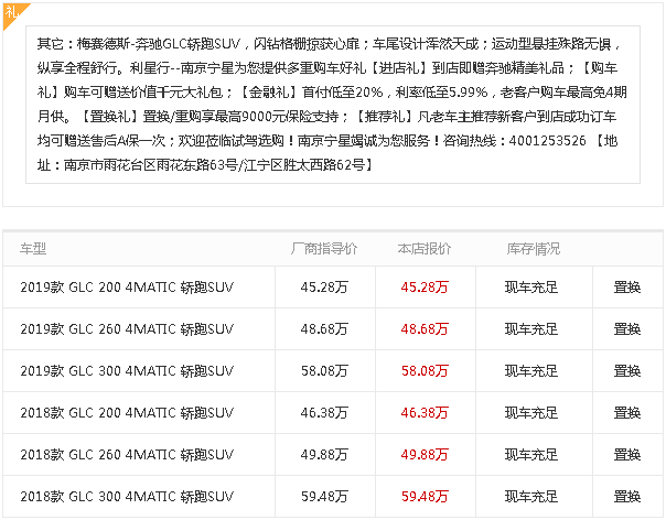置换奔驰GLC级(进口)送8999元大礼包 2019年06月20日 - 2019年06月21日, 南京宁星奔驰置换奔驰GLC级(进口)送8999元大礼包,感兴趣的朋友可以到店咨询购买,具体优惠信息请见下表: