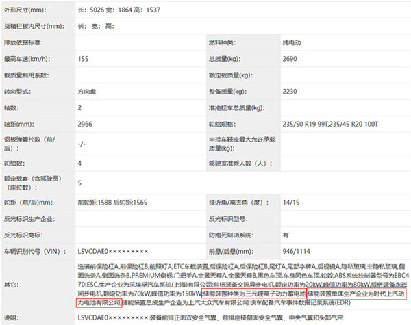 上汽大众申报了ID.7 S双电机车型,有望于第3季度上市。新车前/后电机最大功率分别为80kW/150kW,与ID.7 VIZZION双电机车型动力一致,匹配时代上汽生产的三元锂电池组。