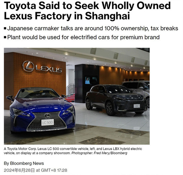 丰田正寻求在上海独资设立雷克萨斯工厂,生产高端电动汽车。雷克萨斯将在上海生产纯电动车,与特斯拉一样独资建厂,主要看中中国的供应链优势,大幅降低生产成本。