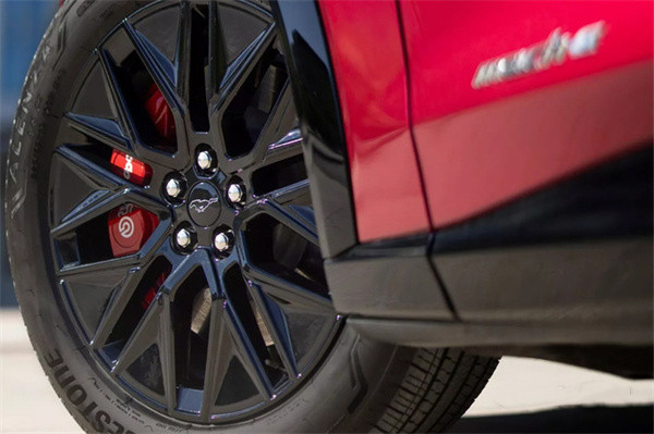 据悉,福特新款Mach-E车型将配备全新的运动外观套件,该套件仅适用于Premium车型,其头部饰板和格栅借鉴了Mustang Mach-E GT的造型设计,并提供19寸熏黑轮毂、熏黑外观套件、Brembo前制动卡钳以及内饰红色对比色缝线等。