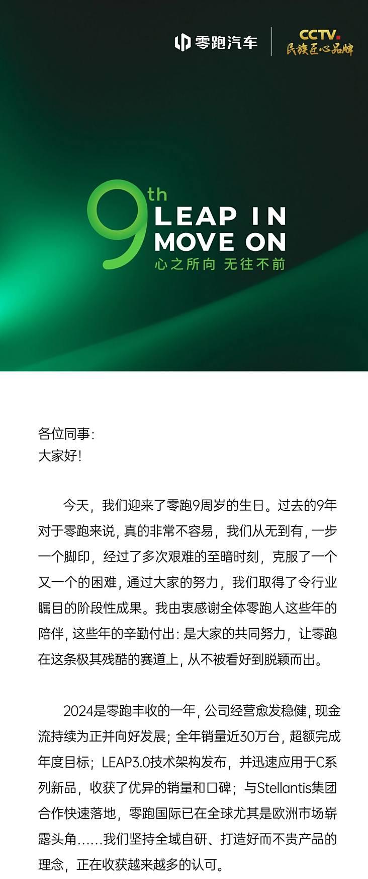 零跑汽车迎来创业九周年,零跑汽车创始人、董事长、CEO朱江明发布全员信称:“我们从无到有,一步一个脚印,经过了多次艰难的至暗时刻,克服了一个又一个的困难,通过大家的努力,我们取得了令行业瞩目的阶段性成果。”