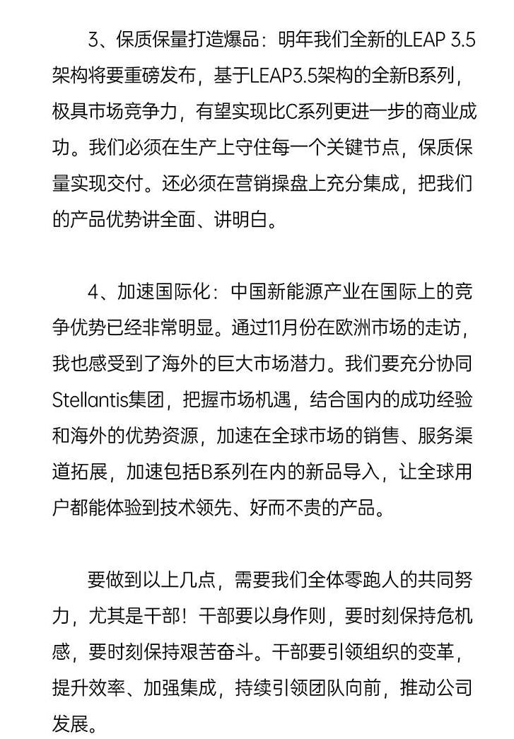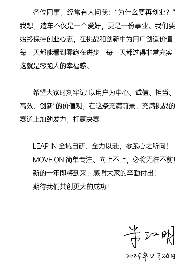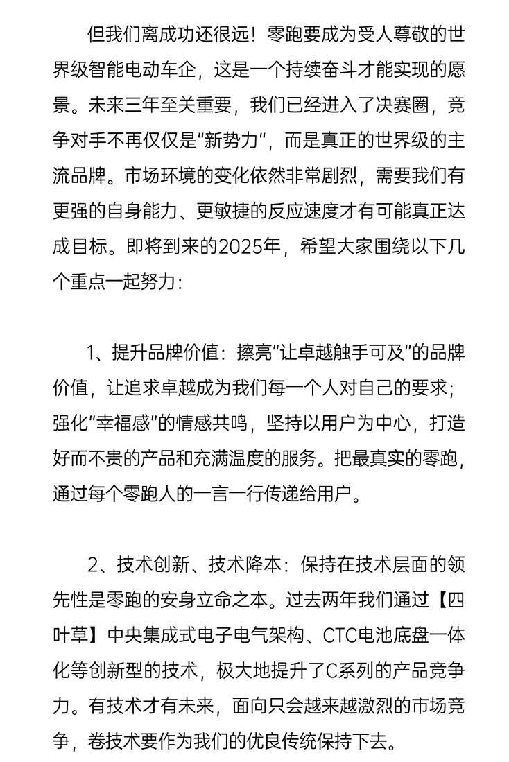 朱江明对零跑、对团队更提出了新的要求:即提升品牌价值;技术创新、技术降本;保质保量打造爆品;加速国际化,以真正为用户创造价值。